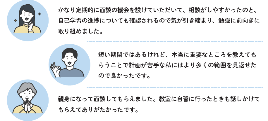 そして、国試まで残り1ヶ月弱。アドバイザー面談で学習計画を一緒に見直し、学習の総仕上げに入ります。受講生の声