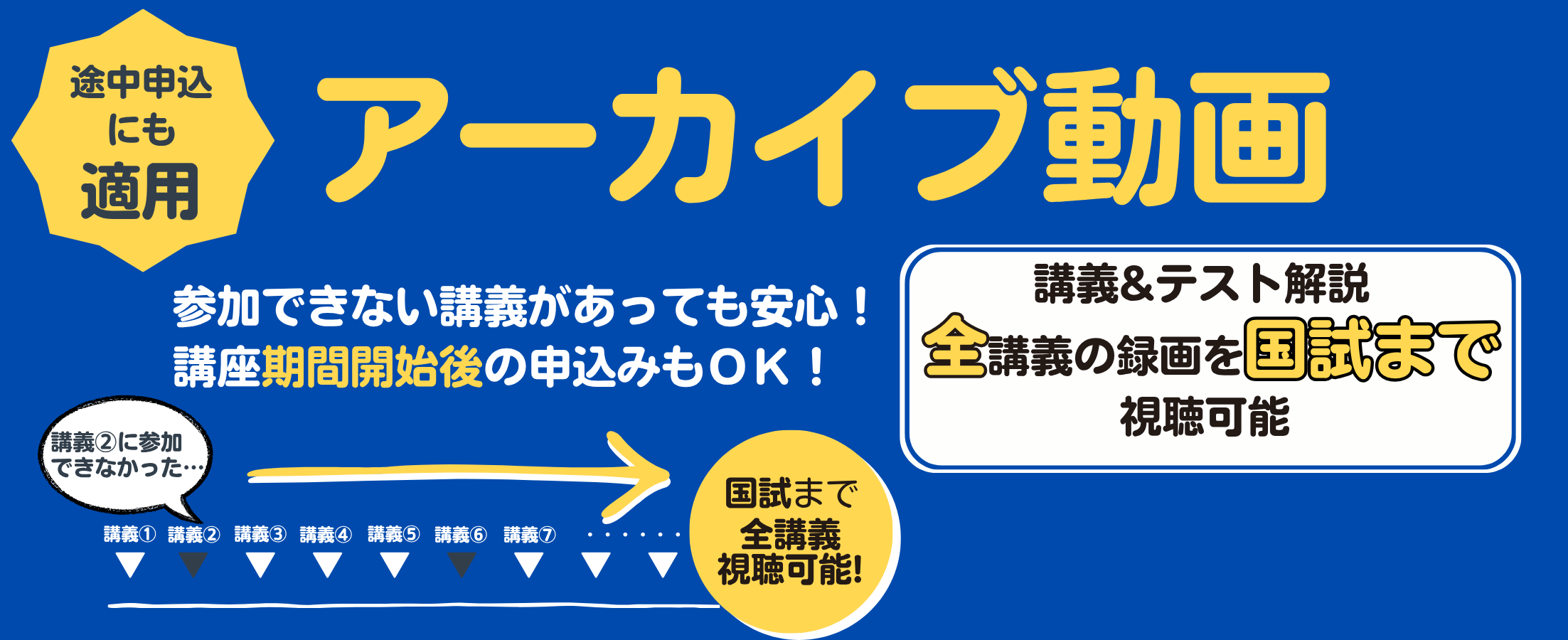 本講座で実施する講義と確認テストの解説は、全てアーカイブ動画として国試本番まで視聴可能です。