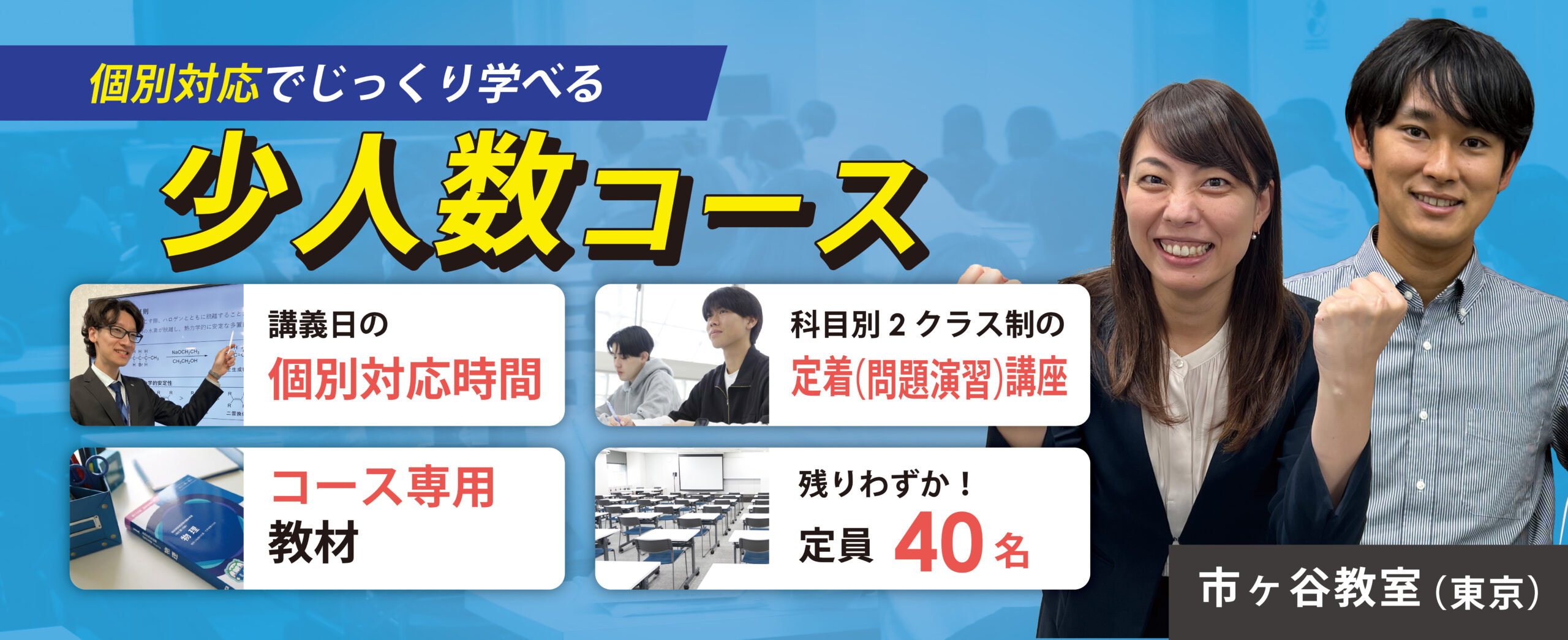 ※市ヶ谷教室は少人数コースのほか、通学1年コースも開校します。